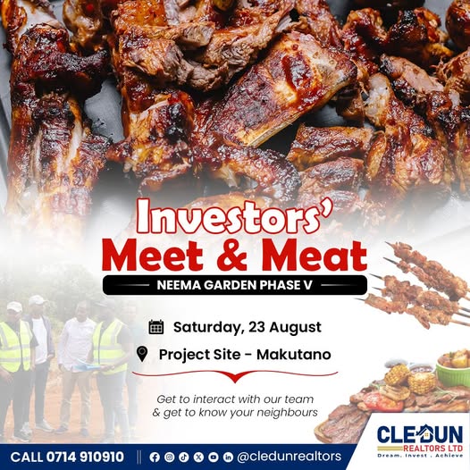 Thika-based property firm, Cledun Realtors Limited, is set to host a major community event dubbed the Investors’ Meet & Meat this Saturday at Neema Garden Phase V in Makutano.