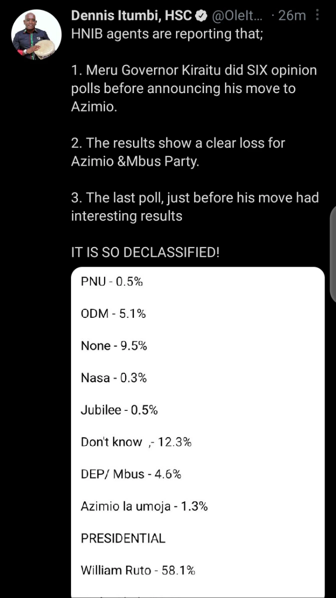 Itumbi claimed that Kiraitu did six opinion polls before announcing his move to Azimio.