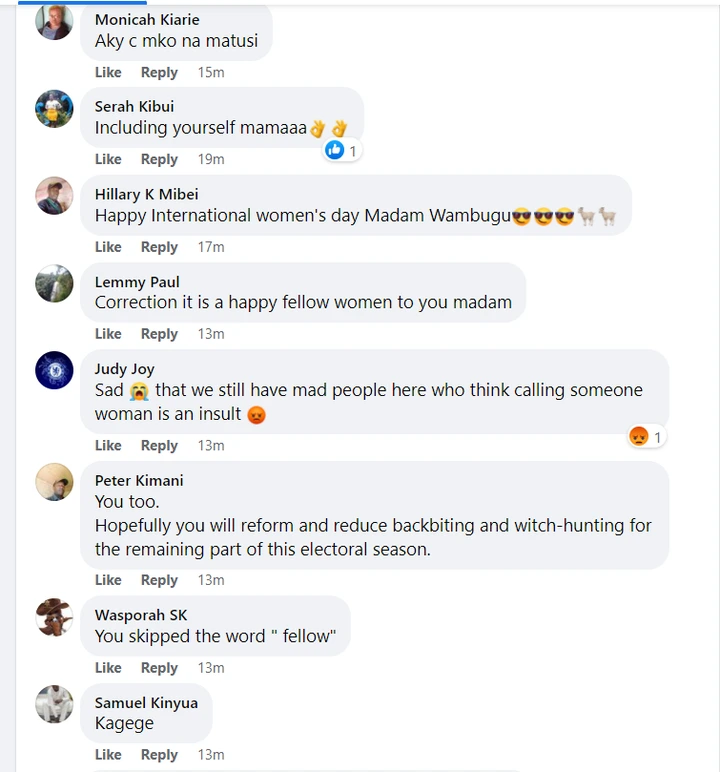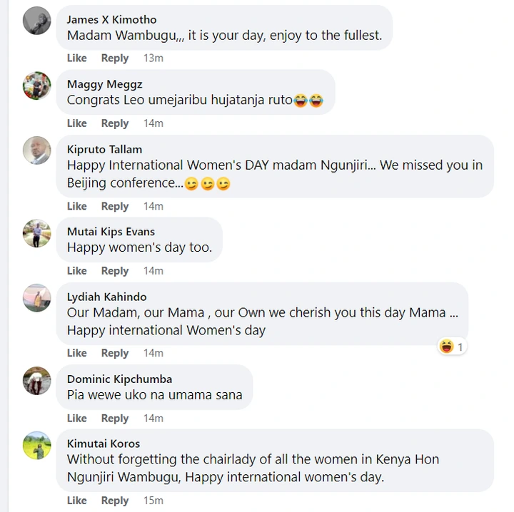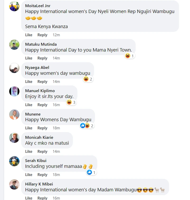 Among the leaders who have penned down their warm messages to Kenyan women includes Nyeri Town MP Ngunjiri Wambugu.