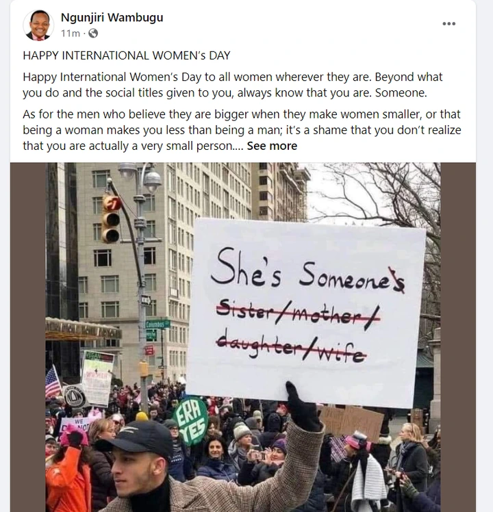 Taking to his Facebook page, the Azimio la Umoja Allied MP penned his sweet message to the country’s women, reminding them how they are important human beings to society.