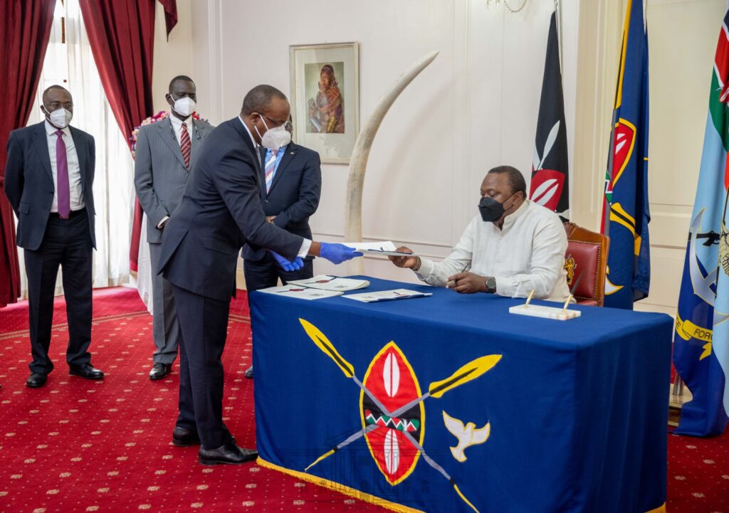 The Bill was presented to the President for signature by State House Deputy Chief of Staff Njee Muturi at a brief ceremony attended Head of Public Service Dr Joseph Kinyua, Senate Speaker Ken Lusaka, his National Assembly counterpart Justin Muturi as well as Parliamentary Majority Leaders Samuel Poghisio (Senate) and Amos Kimunya (National Assembly).