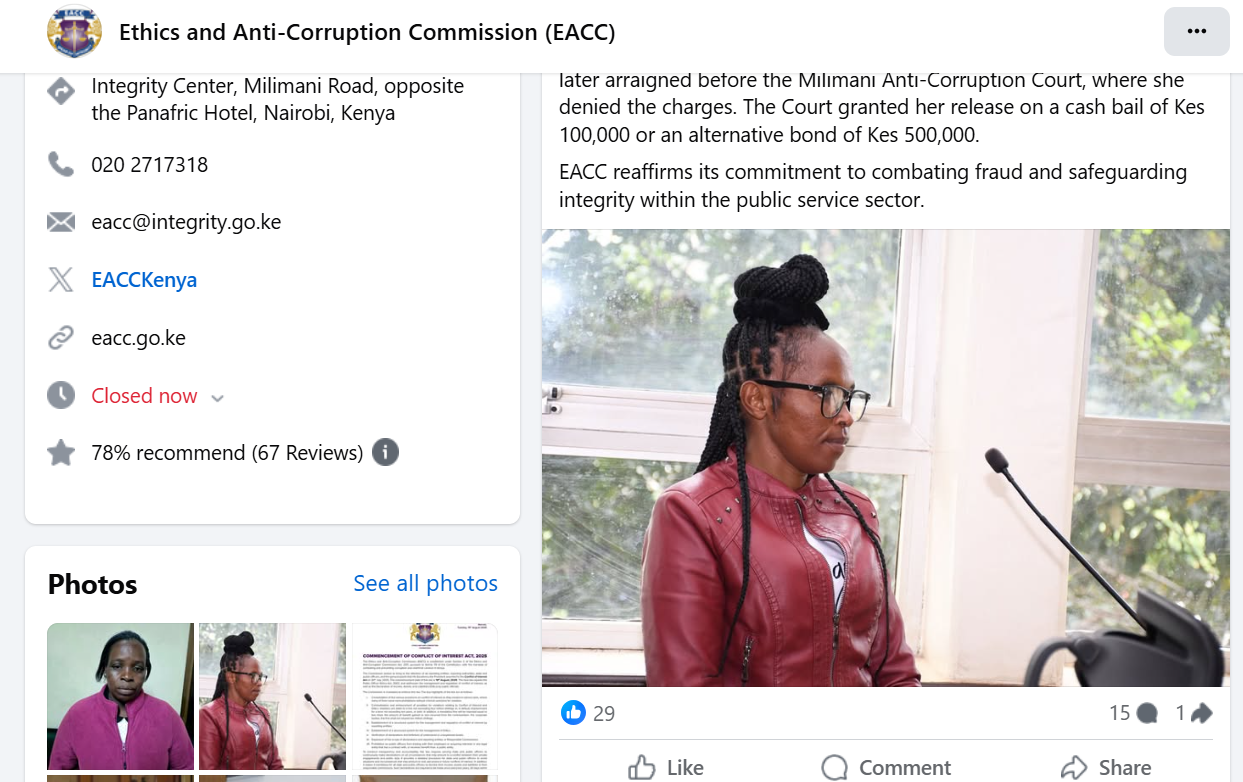 She was processed at the Integrity Centre Police Station before being arraigned at the Milimani Anti-Corruption Court, where she pleaded not guilty. The court released her on a cash bail of KES 100,000, with an alternative bond of KES 500,000.