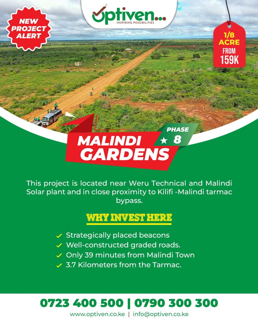 Investment Opportunity: Malindi Gardens Phase 8 Price: Plots from Ksh. 159,000 Contact: 0723 400 500 / 0790 300 300 (Source: Invest in Malindi Phase 8 Today – Optiven Group)
